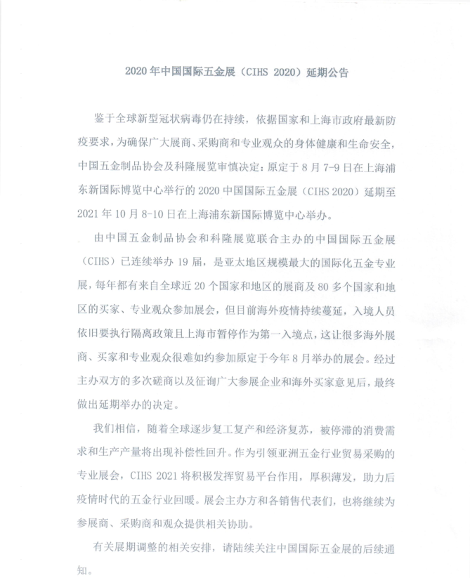 2020中国国际五金展(CIHS2020)延期公告! 2020-07-10 -