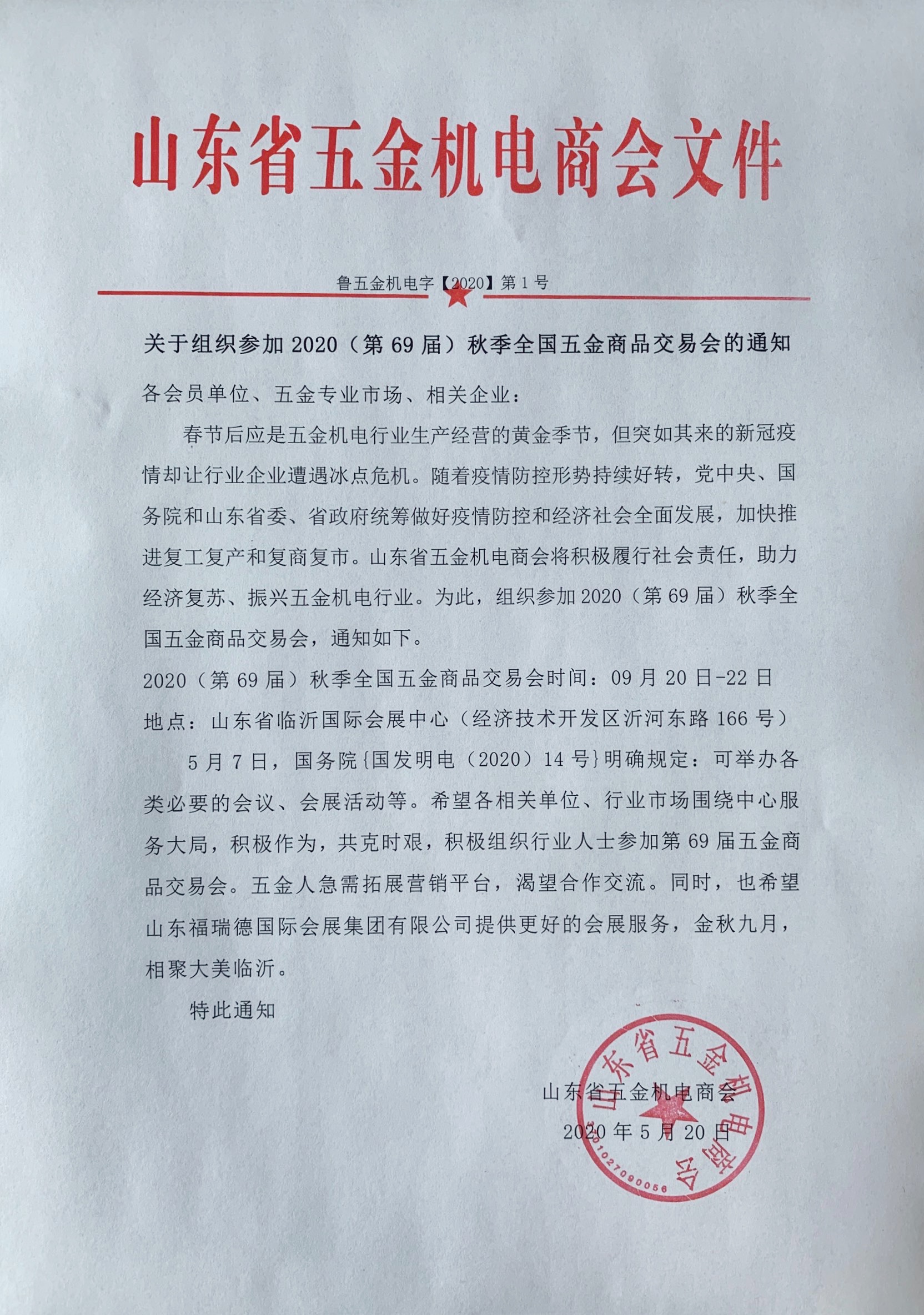 山东省五金机电商会2020年1号文件山东省五金机电商会,关于组织参加2020(第69届)秋季全国五金商品交易会的通知!