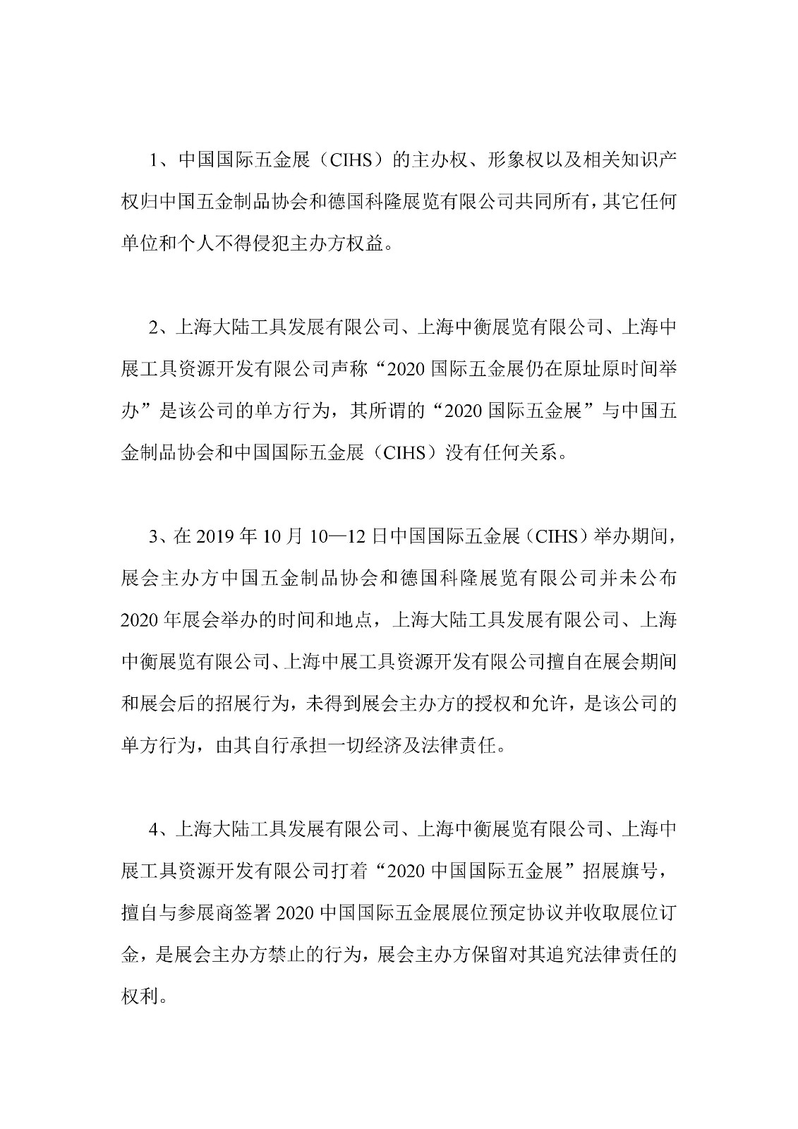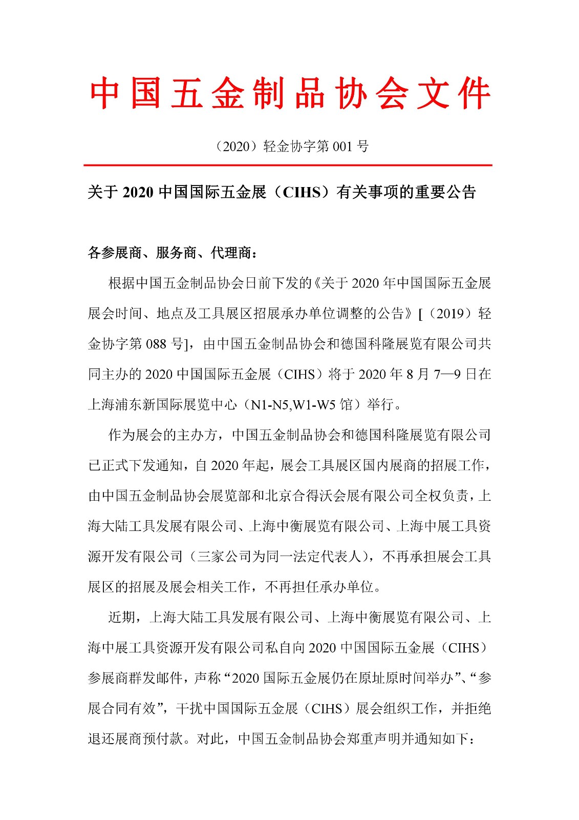 中国五金制品协会-关于2020中国国际五金展(CIHS)重要事项公告!