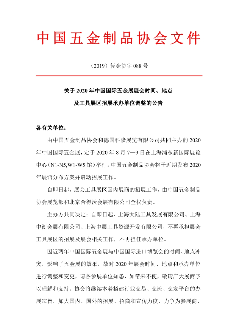 关于2020年中国国际五金展会时间、地点及工具展区招展承办单位调... 2019-12-30 -